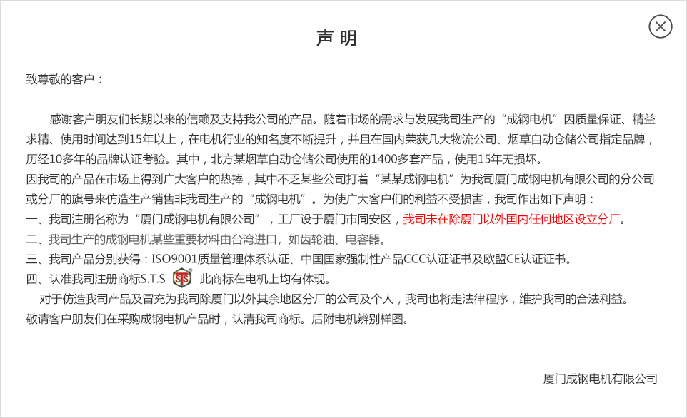 公告信息:   因我司的產(chǎn)品在市場上得到廣大客戶的熱捧,其中不乏某些公司打著“某某成鋼電機”為我司廈門成鋼電機有限公司的分公司或分廠的旗號來仿造生產(chǎn)銷售非我司生產(chǎn)的“成鋼電機”。為使廣大客戶們的利益不受損害,我司作出如下聲明: 一、我司注冊名稱為“廈門成鋼電機有限公司”,工廠設(shè)于廈門市同安區(qū),我司未在除廈門以外國內(nèi)任何地區(qū)設(shè)立分廠。 二、我司生產(chǎn)的成鋼電機采用的齒輪、電容器、潤滑油等均為臺灣進口,并可提供海關(guān)報關(guān)單。 三、我司產(chǎn)品分別獲得:ISO9001質(zhì)量管理體系認證、中國國家強制性產(chǎn)品CCC認證證書及歐盟CE認證證書。 四、認準(zhǔn)我司注冊商標(biāo)S.T.S ???此商標(biāo)在電機上均有體現(xiàn)。 ????對于仿造我司產(chǎn)品及冒充為我司除廈門以外其余地區(qū)分廠的公司及個人,我司也將走法律程序,維護我司的合法利益。 敬請客戶朋友們在采購成鋼電機產(chǎn)品時,認清我司商標(biāo)。后附電機辨別樣圖。